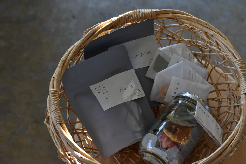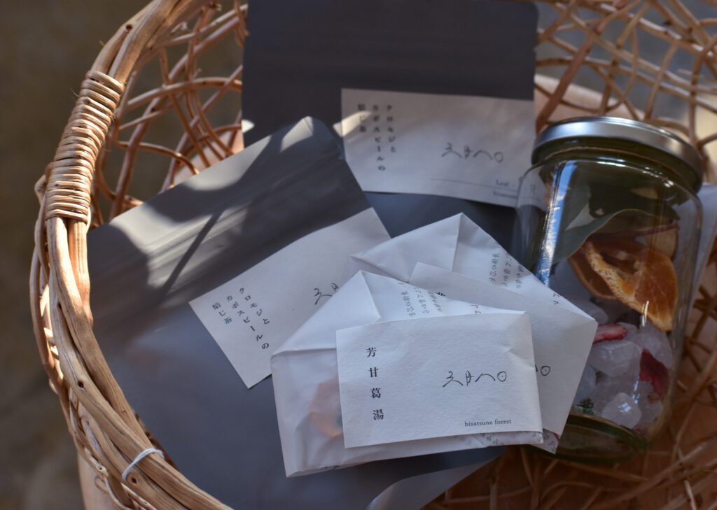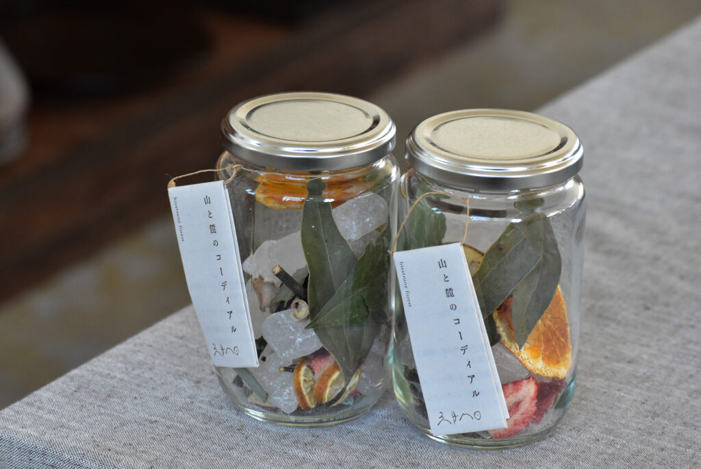森と麓のコーディアル、クロモジとかぼすピールの焙じ茶、芳甘葛湯、六月八日の森で採れる素材をつかって丁寧につくられた体に優しい飲み物です。