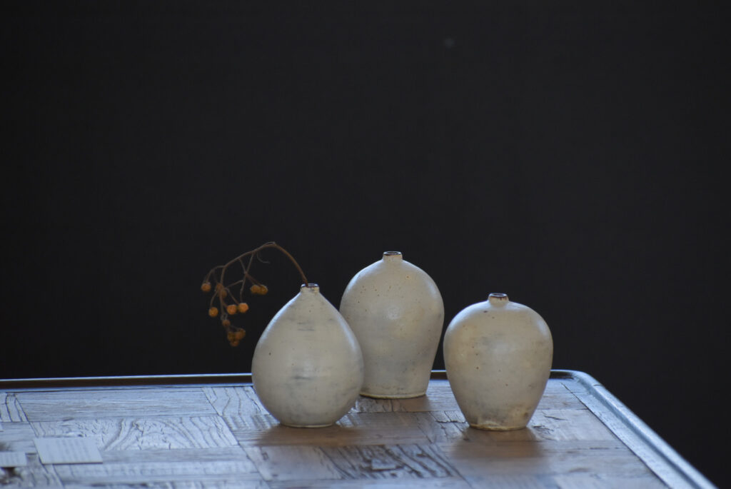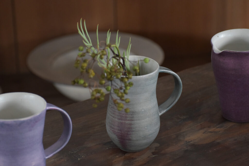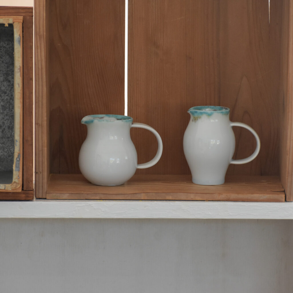 小さめのピッチャーや一輪挿しをオンラインに掲載いたしました。垣野勝司さんのきなりのころんとしたフォルムの一輪挿しに、白く艶のあるミニピッチャーと虹彩に光るミニピッチャー。小さめのピッチャーはミルクやドレッシング、お湯など注ぐ器として、またカトラリー入れやお花飾りとしてなど色々とお使いいただけます。