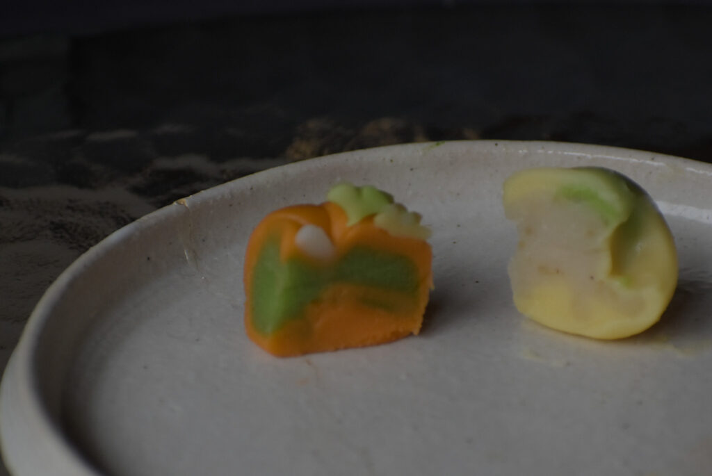 先生の機転で作品はお2つともお持ち帰りいただき、中の餡の抹茶餡と栗餡をそれぞれ
