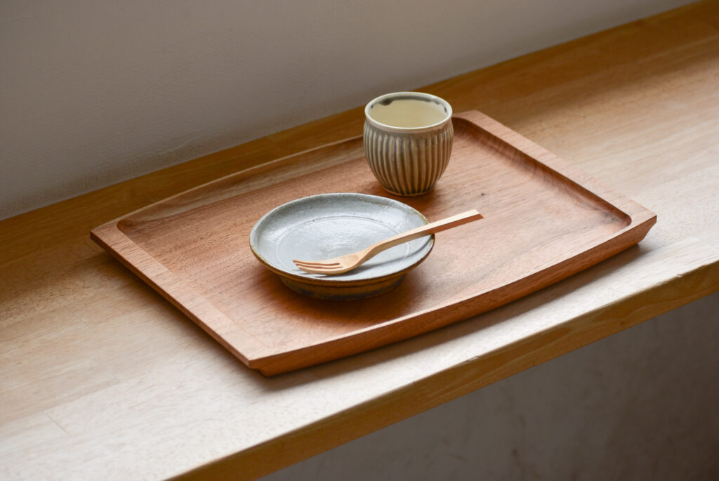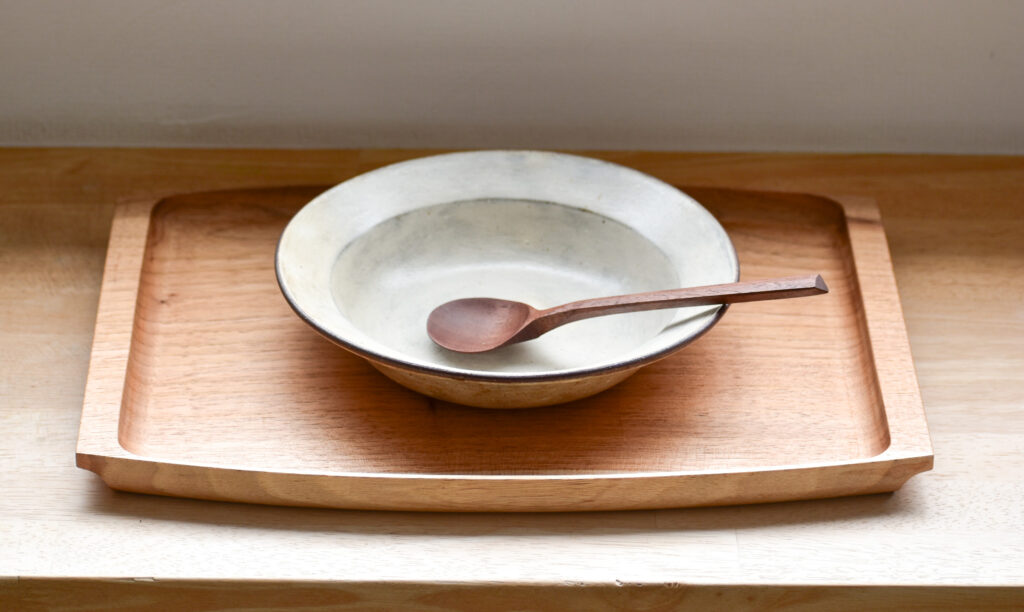 上下にふくらみがあり器がのせやすく、左右の持ち手は親指が内側のカーブにフィットして、とても持ちやすい形状です。お茶や珈琲を運ぶトレーとして、ひとり用のお膳としてなどいろいろに活躍します。